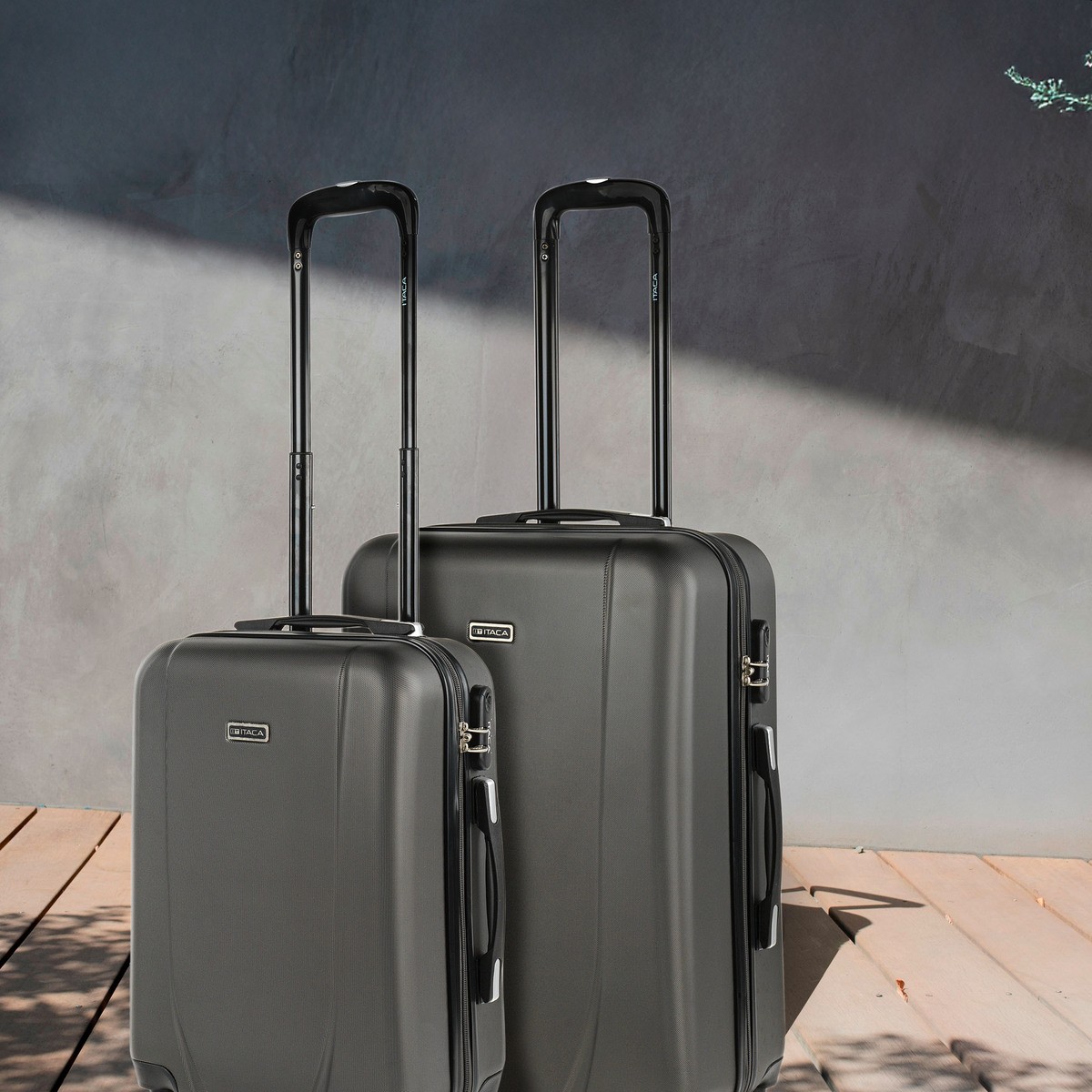 2 Teiliges Set Trollys der Marke ITACA. Alle Produkte ITACA sind ein Qualitätmaßstab, sicherheit und zuverlässig. ITACA ist eine Firma mit viel Erfahrung in das Design und Herstellung von Reisenprodukten, Ein ITACA-Produkt wird immer Ihr treuer Reisebegleiter sein. Diese 2 Teilig Kofferset bietet Ihnen eine ideale Kombination für Reise bis 1 Woche. Die ITACA Koffer sind für Ihren maximaler Konfort in der Reise ausgelegt. Eingeschaften Abmessungen Passagierkabine (Befolgt den Handgepäckbestimmungen von EasyJet, Iberia, Ryanair usw.)  Gesamtabmeßung: 55x39x20 cm Kofferstruktur: 48x38x20 cm Volumen ca. 35L Gewicht: 2,85 Kg Mittlerekoffer Gesamtabmeßung: 65x42x24 cm Kofferstruktur: 59x39x27 cm Volumen ca. 70L Gewicht: 3,35 Kg Material: ABS raue Oberfläche gegen Kratzer Schluss: Integriertes 3-stellig Vorhängeschloss für zusätzliche Sicherheit. Reißverschluss: Doppel-Cursor mit Löcher für Vorhängeschlösser. Sanft Schlupf. Griffe: Oberer (2 Koffer) und seitlicher (XL) Griffe. Maximaler Komfort in jeder Stellung. Schaft: Ergonomischer Doppelrohr-Teleskopgriff mit Blockierende Knopf. Räder: 4 Schwenkräder. Steif, licht und stroßfest. Innenseite Bedrucktes Innenfutter Abscheiderfach mit Reißverschluss. Verstellbare Befestigungsbänder. Mehrere Fächer. Sehr vollständig