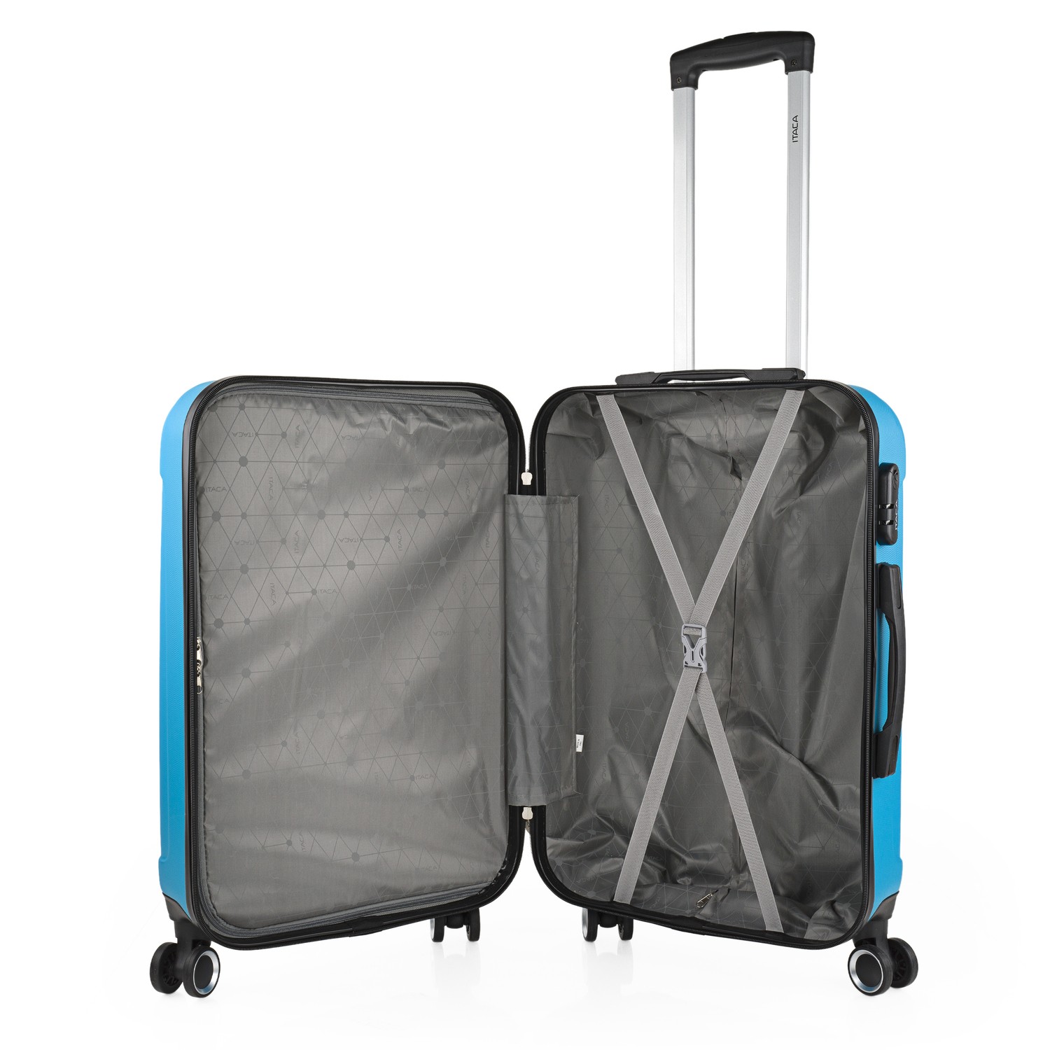 3 Teiliges Set Trollys der Marke ITACA. Alle Produkte ITACA sind ein Qualitätmaßstab, sicherheit und zuverlässig. ITACA ist eine Firma mit viel Erfahrung in das Design und Herstellung von Reisenprodukten, Ein ITACA-Produkt wird immer Ihr treuer Reisebegleiter sein. Diese 3 Teilig Kofferset bietet Ihnen eine ideale Kombination für alle Reisentyp, Wochenenden, Kurz- und Langreisen. Die ITACA Koffer sind für Ihren maximaler Konfort in der Reise ausgelegt. Details Abmessungen Passagierkabine (Befolgt den Handgepäckbestimmungen von EasyJet, Iberia, Ryanair usw.)  Gesamtabmeßung: 55x37x20 cm Kofferstruktur: 48x35x20 cm Volumen ca. 35L Gewicht: 2,60 kg Mittlere Gesamtabmeßung: 63x42x24 cm Kofferstruktur: 48x42x24 cm Volumen ca. 54L Gewicht: 3,20 kg Groß XL Gesamtabmeßung: 73x48x28 cm Kofferstruktur: 66x47x27 cm Volumen ca. 85 L Gewicht 3,90 kg Außenseite Material: ABS raue Grenzfläche Kratzfestigkeit. Integriertes 3-stellig Vorhängeschloss Reißverschluss: Doppel-Cursor mit Löcher für Vorhängeschlösser. Sanft Schlupf. Oberer und seitlicher Griffe. Maximaler Komfort in jeder Position. . Ergonomischer Doppelrohr-Teleskopgriff mit Blockierende Knopf. 4 Räder omnidirektionale 360° drehbare. Innenseite Bedrucktes Innenfutter Zentrales Abscheiderfach mit Reißverschluss. Verstellbare Befestigungsbänder. Mehrere Fächer. Sehr vollständig