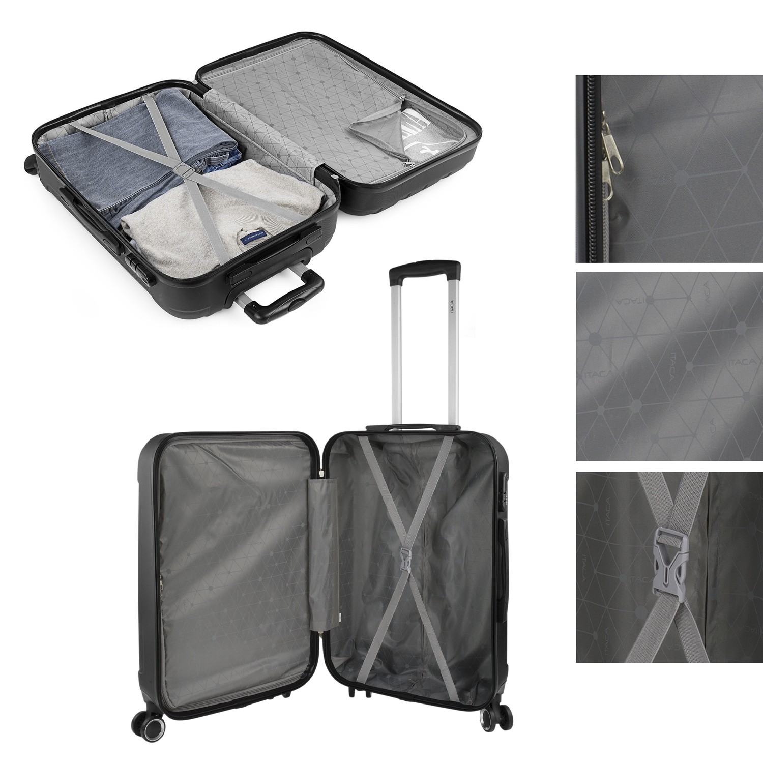 ITACA bringt seine neue Kofferkollektion auf den Markt. Toilettenartikel + 2 Koffer Größe 50/60 aus ABS, einem leichten und widerstandsfähigen Material. Ein weiterer Vorteil ist, dass es mit seinen 4 leichtgängigen, in mehrere Richtungen schwenkbaren Rädern eine größere Manövrierfähigkeit ermöglicht und sein Teleskop-Trolley mit Versicherung die Handhabung komfortabler macht. Es hat einen Reißverschluss mit Doppelschieber und ein LOCK-Kombinationsschloss für mehr Sicherheit. Im Inneren sehen wir das personalisierte Innenfutter der Marke mit einer zentralen Trennung. Es enthält innenliegende elastische Riemen, die es ermöglichen, den Inhalt zu halten. Kabine (Entspricht den Handgepäckbestimmungen von EasyJet, Iberia, Ryanair usw.) Der kleine Koffer, ein LOW COST CAB, misst 37 x 55 x 20 cm. und wiegt 2,60 kg. Der mittelgroße Koffer misst 65 x 42 x 23 cm. und wiegt 3,30 kg. Der Kulturbeutel verfügt über ein Innenfach mit mittiger Aufteilung, ein Reißverschlussfach für die kleinsten Dinge und ein elastisches Band, um die kleinsten Gegenstände sicher zu verstauen. Es misst 31x22x15 cm und wiegt 0,8 kg.