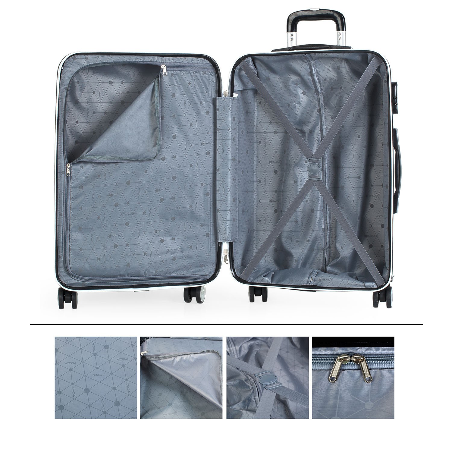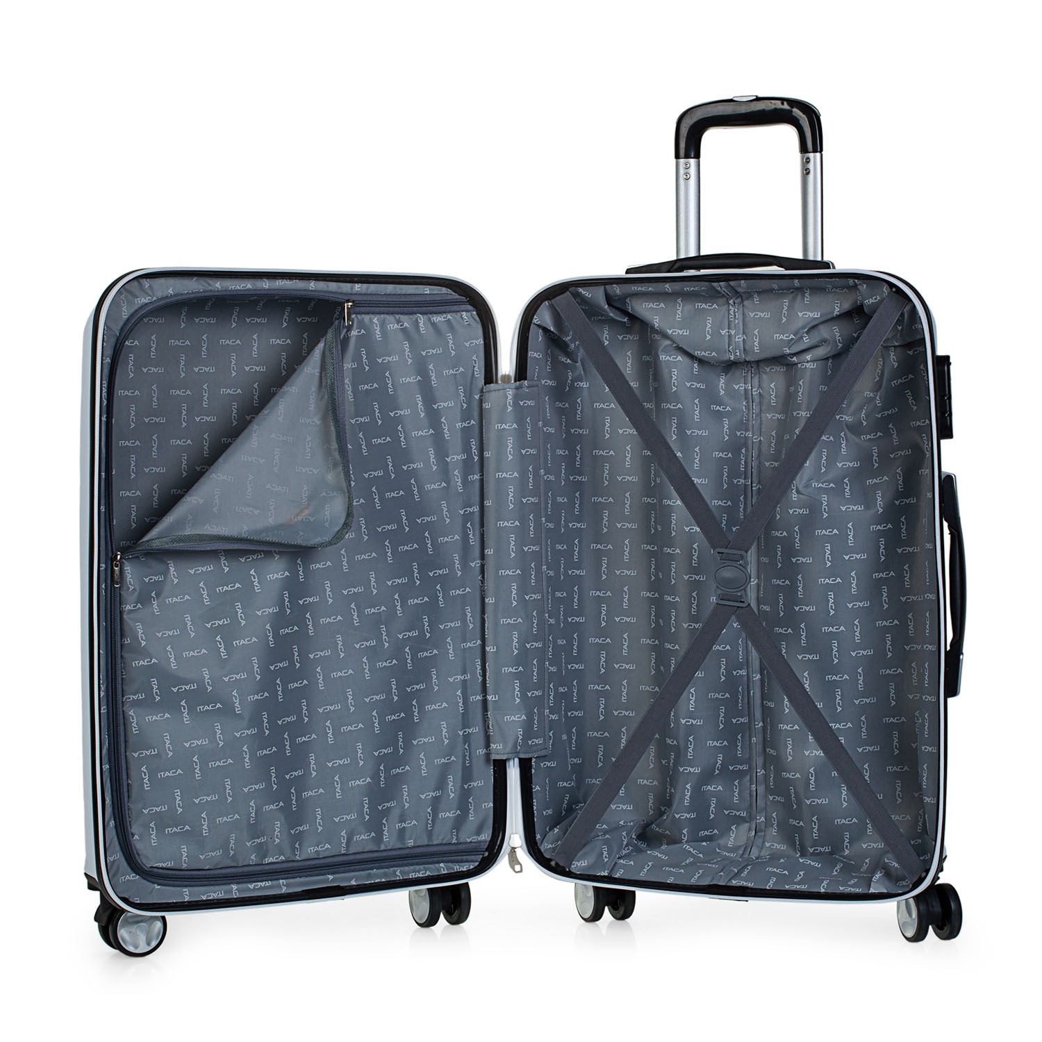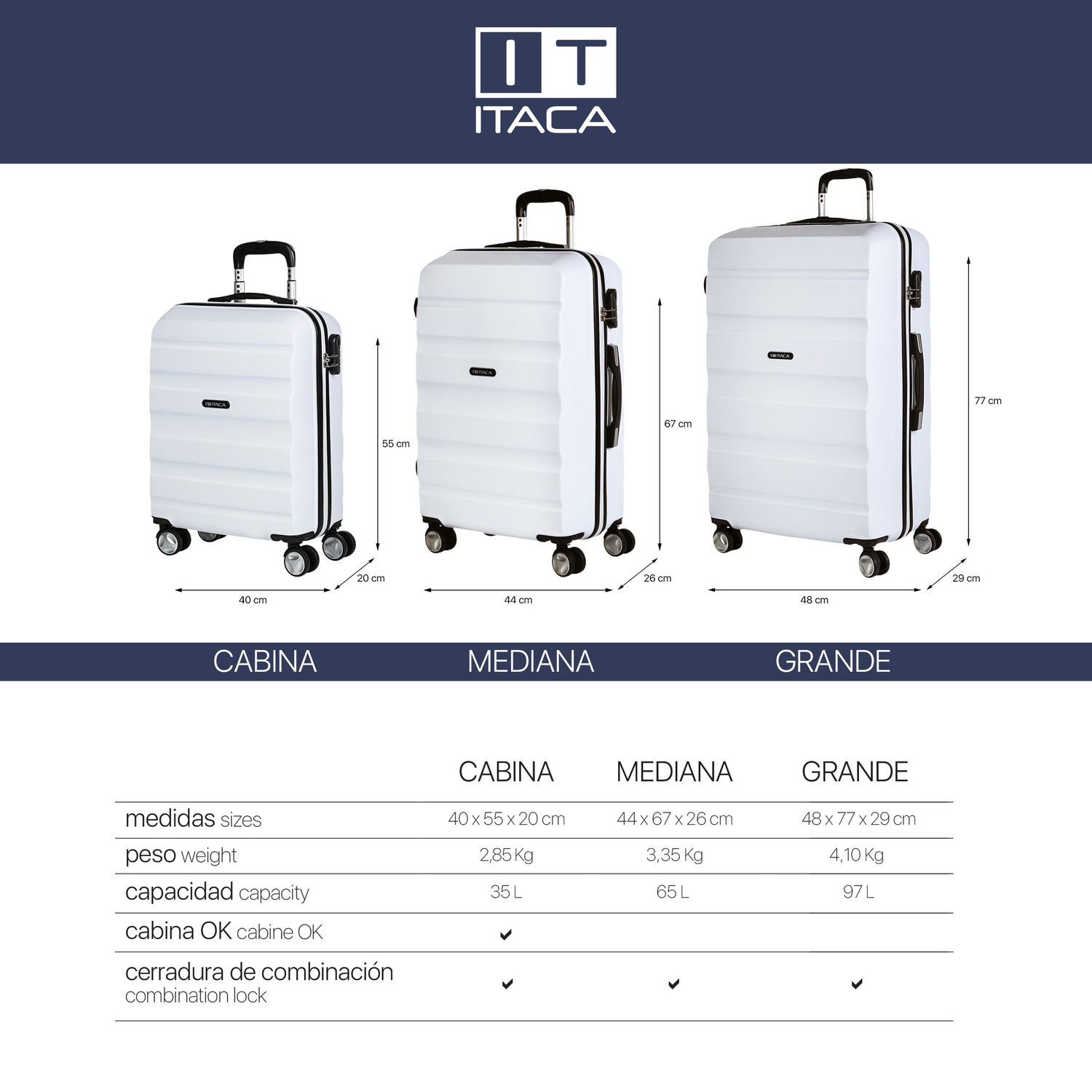 Juego completo set de tres maletas trolley de la firma ITACA. 4 ruedas grandes dobles giratorias y mango telescópico.