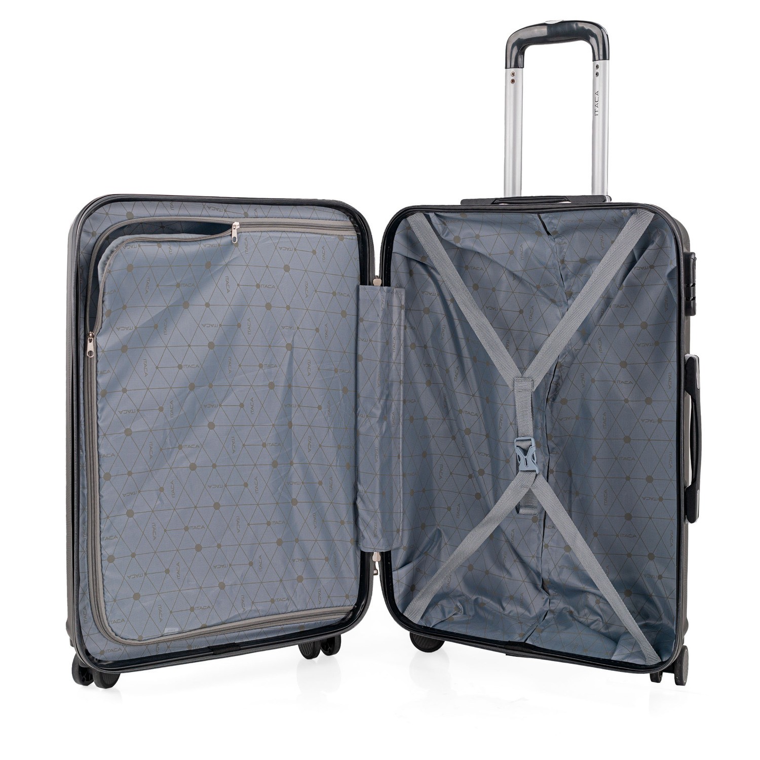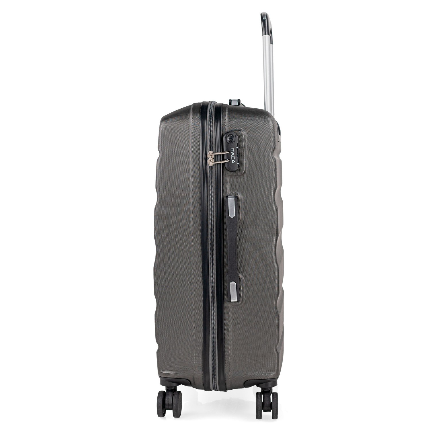 Juego completo set de tres maletas trolley de la firma ITACA. 4 ruedas grandes dobles giratorias y mango telescópico.
