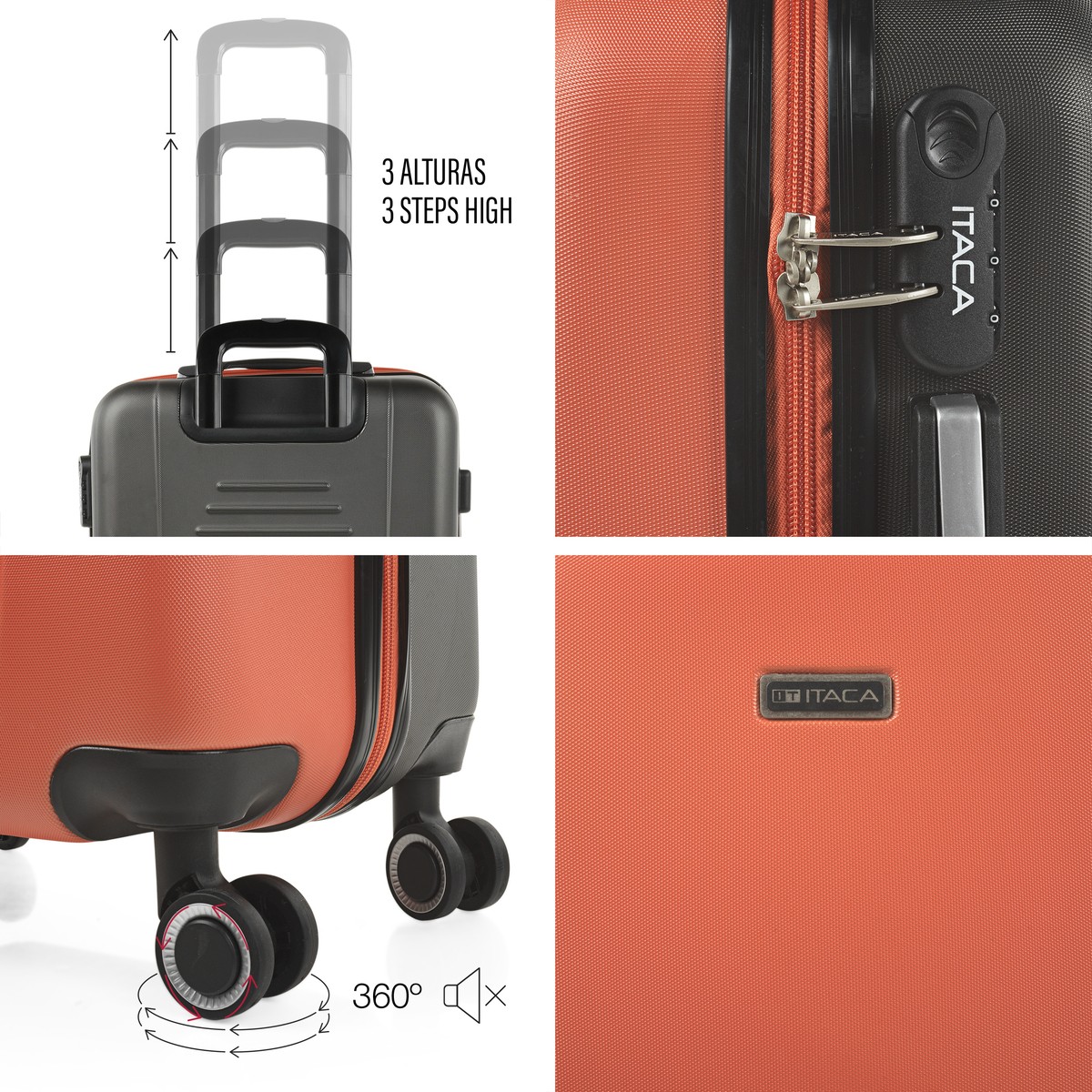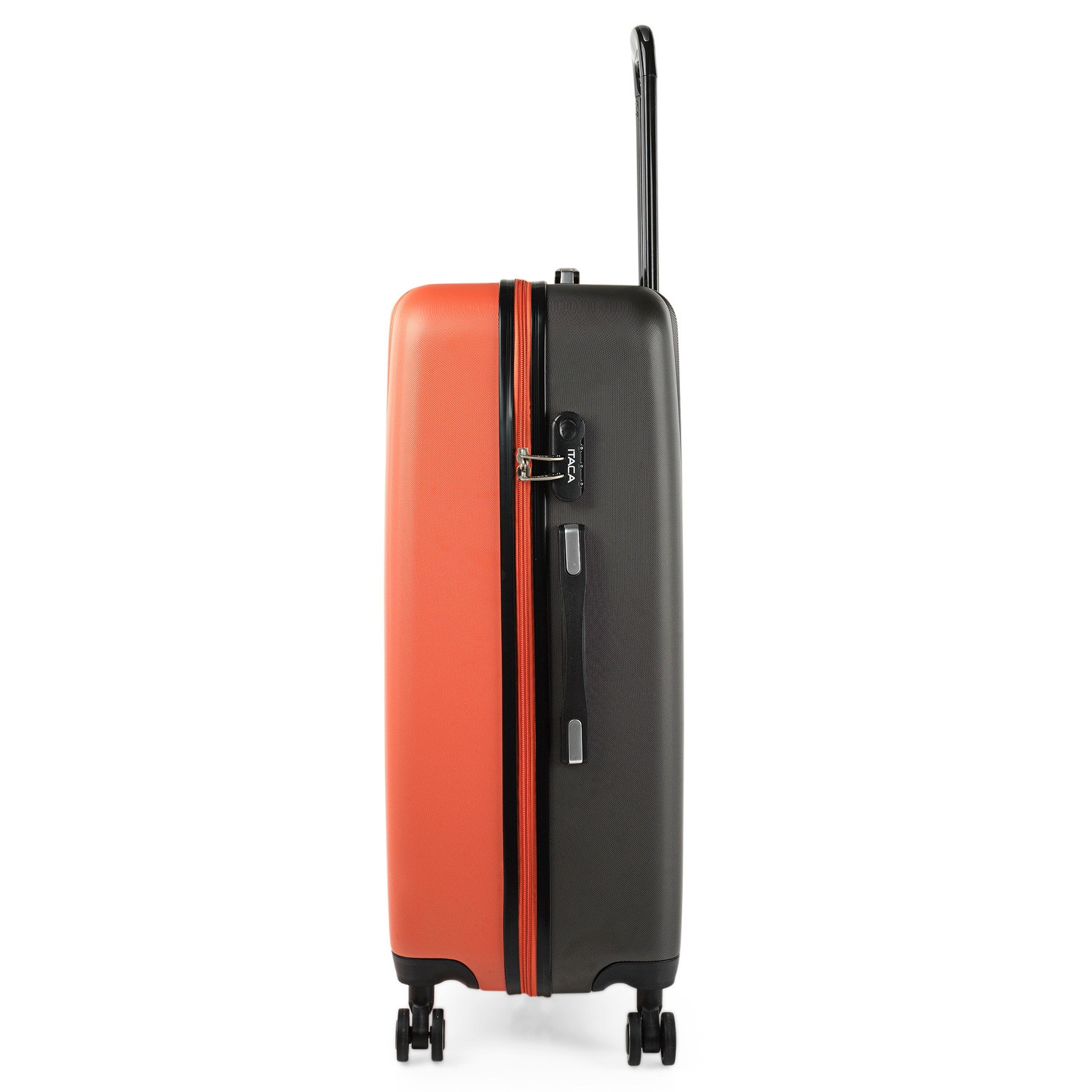 Trolley grande de la marca ITACA con un diseño exclusivo y dispone de varios coloridos bicolores. Con cuatro ruedas giratorias y mango telescopico. Con forro interior. Dispone de una asa superior y lateral. La cremallera es con doble cursor y tiene una cerradura de combinación. La maleta grande mide 50 x 75 x 29cm y pesa 4,10 Kg. Las maletas son de ABS.