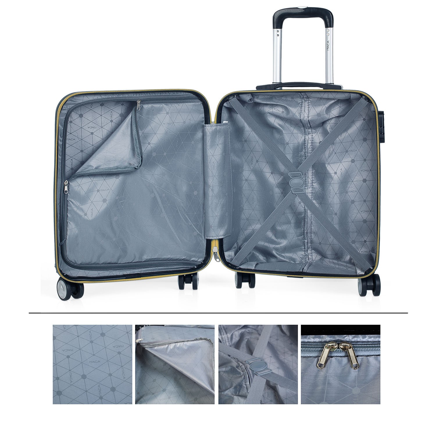 Petite valise cabine trolley de la marque ITACA. Bagage à main. Taille acceptée par les low cost. Voyages courts. Tous les produits ITACA constituent une référence en matière de qualité, de sécurité et de confiance. ITACA est une marque avec beaucoup d expérience dans le design et la fabrication de produits de voyage. Un produit ITACA sera toujours votre fidèle compagnon de voyage. br> Cette valise est parfaite pour les voyages courts et les voyages d affaires. Les valises ITACA sont conçus pour un maximum de confort pendant le voyage. Dimensions Cabine (Conforme aux règles des bagages à main EasyJet, Iberia, Ryanair etc.) Total: 55x39x20 cm Corps: 48x38x20 cm Volume: 35 L Poids: 2,85 kg Caractéristiques principales Extérieur Matériau: ABS texturé anti-rayures. Fermeture: cadenas à combinaison intégré à 3 chiffres. Fermeture à glissière: Double curseur avec trous pour cadenas. Glisse très lisse. Anses: Anses retractables supérieur et latéral. Confort maximum dans toutes les positions. Poignée: Poignée télescopique double tube ergonomique avec bouton-pressoir. Roues: 4 roues doubles rotatives omnidirectionnelles à 360°. Rigide, léger et résistant aux chocs et aux rayures. Intérieur Doublure intérieure à motifs. Compartiment séparateur avec fermeture à glissière. Bandes élastiques réglables Plusieurs compartiments. Très complet.
