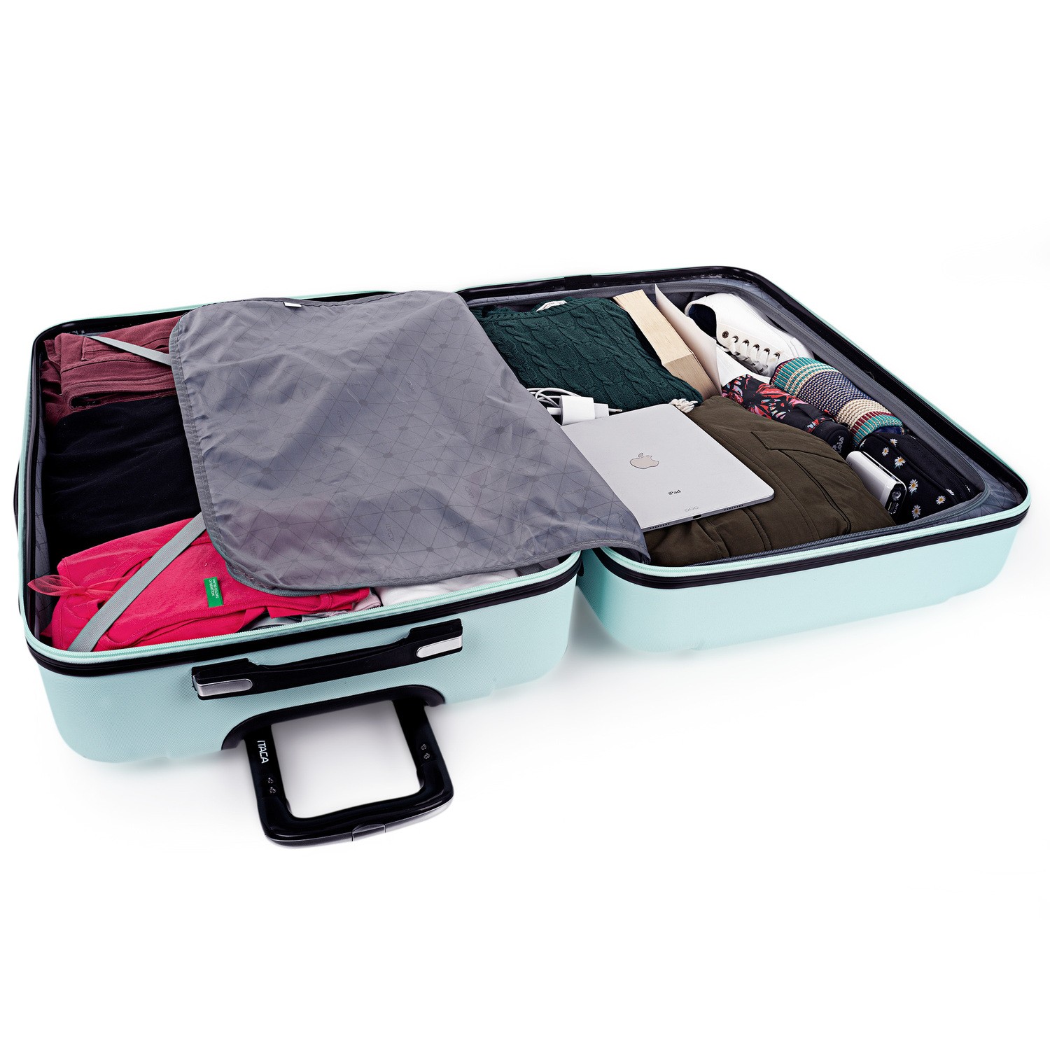 Chariot de grande marque d Ithaque avec un design exclusif et a plusieurs deux couleurs colorées. Avec roues pivotantes quatre et poignée télescopique. Avec doublure intérieure. Il a un haut et le côté poignée. La fermeture éclair est avec lit double et une serrure à combinaison. La grande valise de 50 75 par 30 cm et pèse 4,10 Kg. Les valises sont ABS.