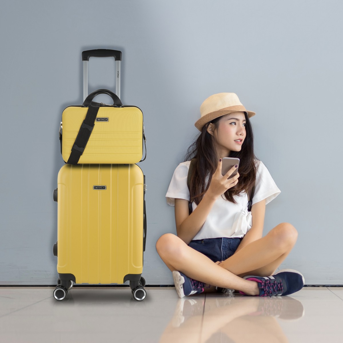 Toiletry bag + cabin suitcase size 50 made of ABS, a light and resistant material. Another advantage is that it allows greater maneuverability with its 4 smooth rolling multi-direction 360 ° swivel wheels and its telescopic trolley with insurance make its handling more comfortable. It has a zip with double slider and a LOCK combination lock for greater security. Inside, we see the brand s personalized lining, with a central separation. It contains interior elastic straps that allow the content to be held.