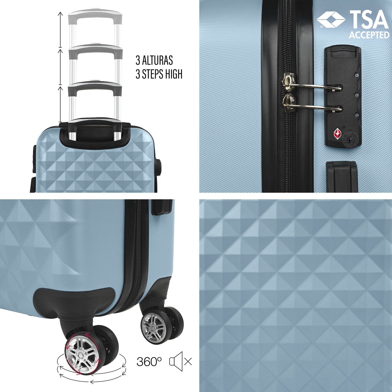 Hand Luggage Number One inside the Travel Suitcases of the ITACA firm. Hand luggage. Size allowed low cost. Hand Luggage Number One inside the Travel Suitcases of the ITACA firm. Hand luggage. Size allowed low cost. The interior is lined with custom Nylon according to the design of the suitcase. For the organization of luggage has straps, pockets and zippers to ensure fastening and order. The 4 double wheels ensure easy and manageable transport, the extendable handle adapts the suitcase to any user height and the TSA closure provides the peace of mind of going through any customs without having to force and break the opening by the authorities. Measures: 38x55x20 cm. Weight: 2.74 kg. Capacity: 36 L. Material: ABS.