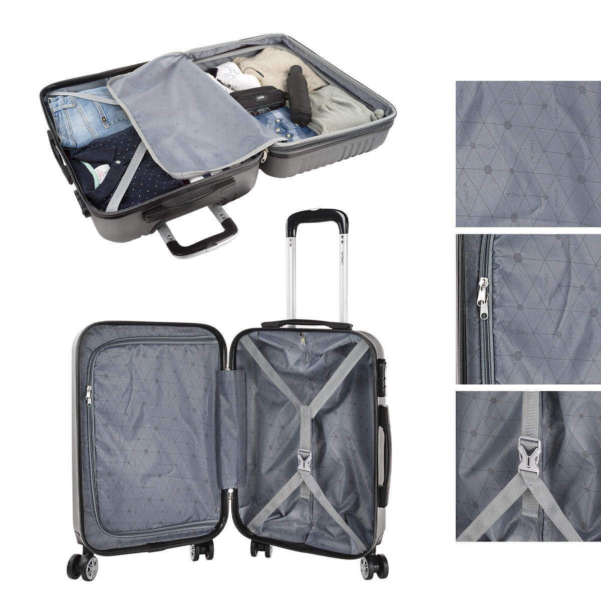 Set of trolley suitcase, cabin, and beauty case ABS, ITACA brand. Hand luggage. Allowed size for low cost flights. Short travels.
