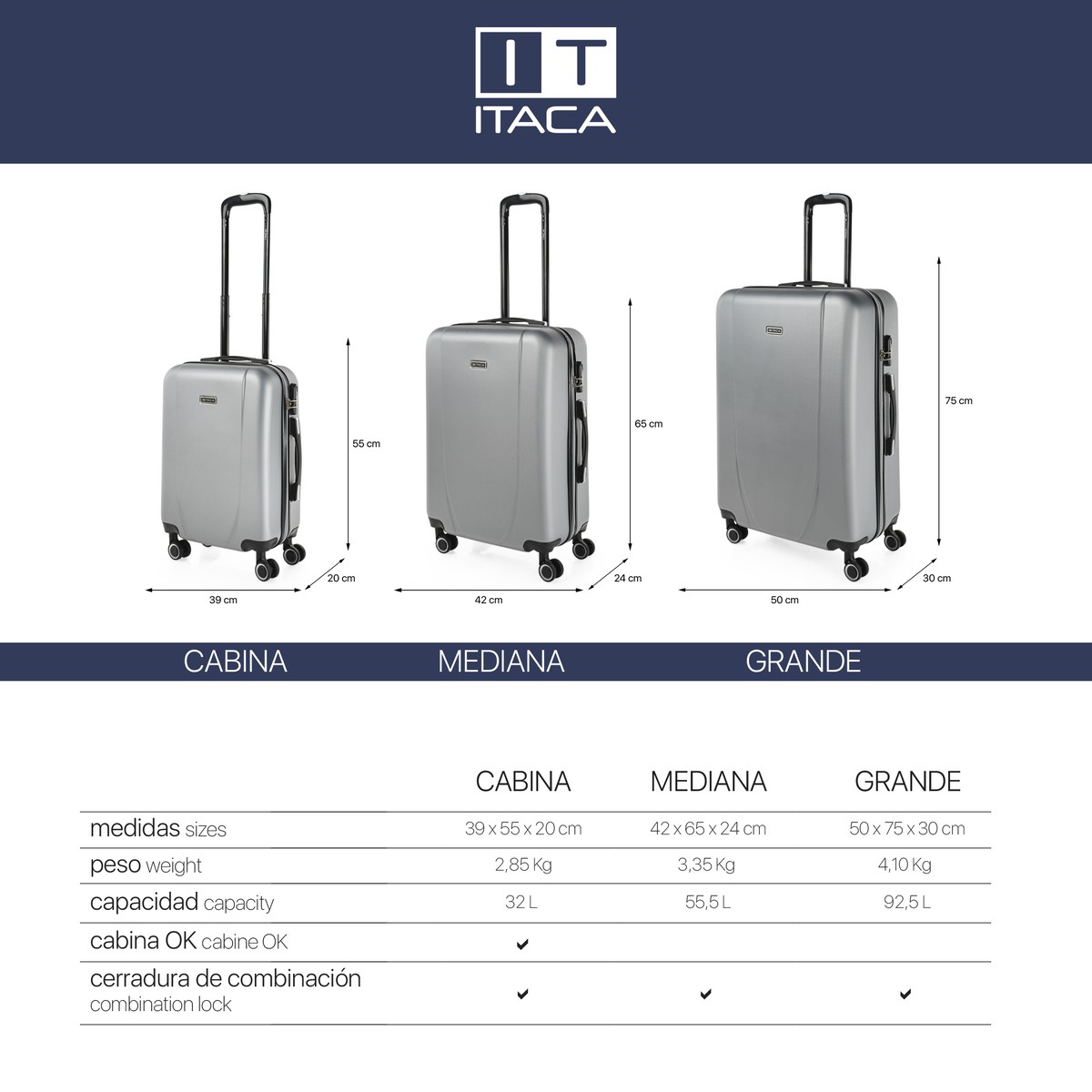 Set di 2 valigie trolley da viaggio da ITACA. Tutti i prodotti ITACA sono un punto di riferimento per qualità, sicurezza e affidabilità. ITACA è un azienda con molta esperienza nella progettazione e produzione di prodotti di viaggio. Un prodotto ITACA sarà sempre il tuo fedele compagno di viaggio. Questo set di 2 valigie ti offre una combinazione ideale per viaggi di fine settimana e viaggi brevi. Le borse ITACA sono progettate per il massimo comfort durante il viaggio. Dimensioni Cabina (conforme ai regolamenti sul bagaglio di EasyJet, Iberia, Ryanair, ecc.) Totale: 55x38x20 cm Corpo: 48x36x20 cm Volume: 35 L Peso: 2,80 kg Medio Totale: 65x44x24 cm. Corpo: 58x42x24 cm Volume: 70 L Peso: 3,35 kg Funzioni principali Esterno Materiale: ABS strutturato antigraffio. Chiusura: lucchetto a combinazione integrata a 3 cifre per una maggiore sicurezza. Zip: doppio cursore con fori per lucchetto. Scivolare molto liscio. Maniglie: maniglie a scomparsa superiore e laterale. Blocchi di supporto orizzontale Massimo comfort in qualsiasi posizione. Maniglia: manico telescopico ergonomico a doppio tubo con pulsante di blocco. Ruote: 4 ruote omnidirezionali rotanti a 360 °. Rigido, leggero e resistente agli urti e ai graffi. Interni Fodera interna modellata. Scomparto separatore con cerniera. Bande di supporto regolabili. Scomparti multipli. Molto completo