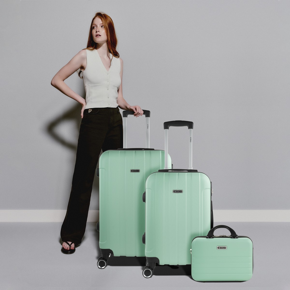 Set da toilette + 3 valigie taglia 50/60/70 realizzate in ABS, un materiale leggero e resistente. Un altro vantaggio è che consente una maggiore manovrabilità con le sue 4 ruote girevoli multidirezionali a 360 ° a rotolamento regolare e il suo carrello telescopico con assicurazione rendono la sua maneggevolezza più confortevole. Ha una zip con doppio cursore e un lucchetto a combinazione LOCK per una maggiore sicurezza. All interno, vediamo la fodera personalizzata del marchio, con una separazione centrale. Contiene cinghie elastiche interne che consentono di trattenere il contenuto.