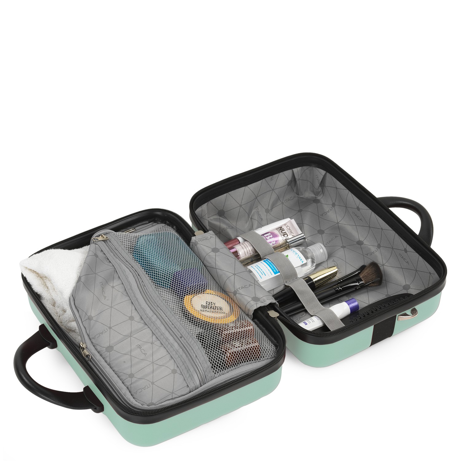Set di beauty case + 2 valigie misure 60/70 realizzate in ABS, un materiale leggero e resistente. Un altro vantaggio è che consente una maggiore manovrabilità con le sue 4 ruote girevoli multidirezionali a 360 ° a rotolamento regolare e il suo carrello telescopico con serratura che lo rendono più comodo da maneggiare. Ha una doppia zip scorrevole e un lucchetto a combinazione per una maggiore sicurezza. Allinterno, possiamo vedere la fodera personalizzata del marchio, con separazione centrale. Le cinghie elastiche interne consentono di tenere il contenuto in posizione.