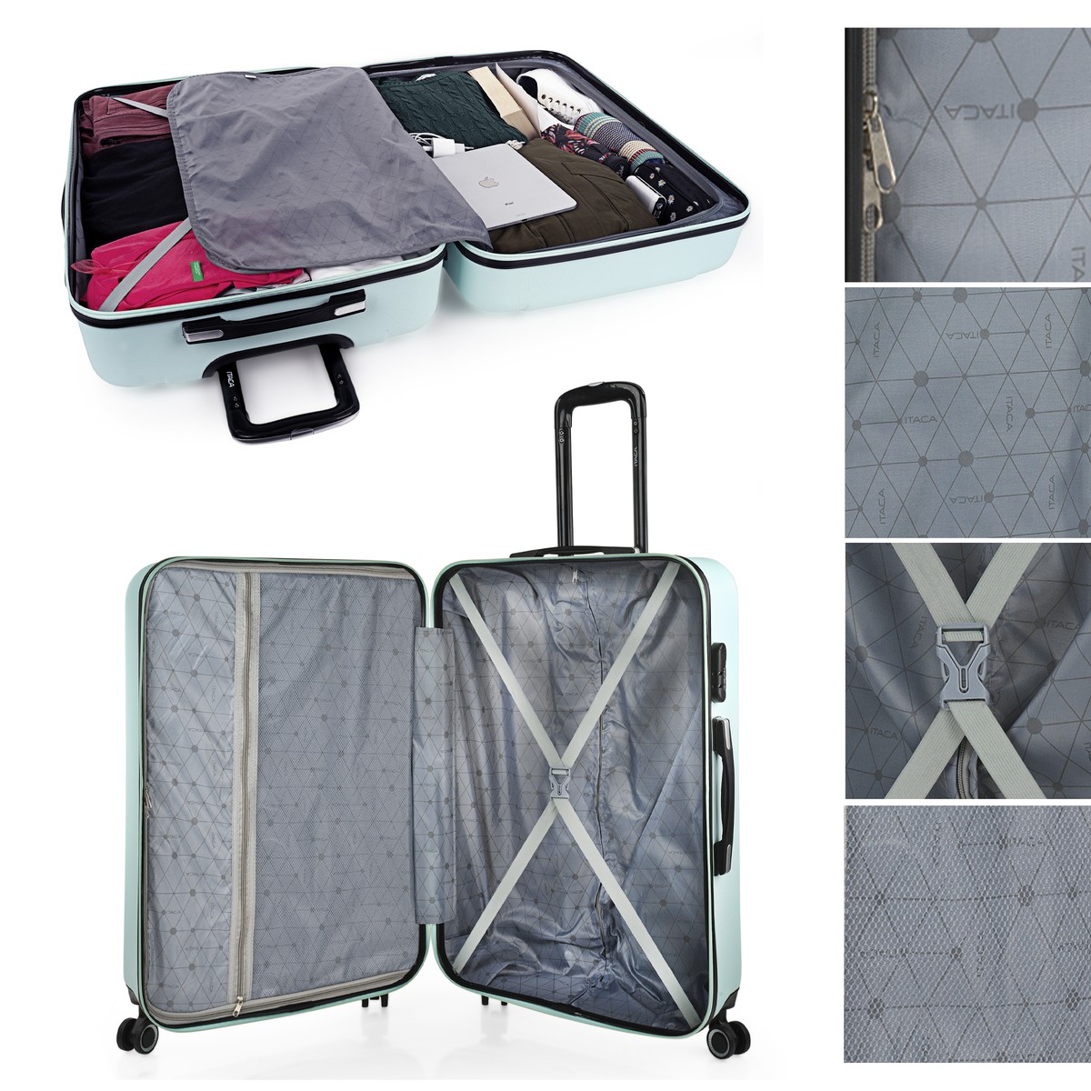 Carrello grande marca di Itaca con un design esclusivo e dispone di due diversi colori variopinti. Con quattro ruote girevoli e maniglia telescopica. Con fodera interna. Caratteristiche di una maniglia superiore e laterale. La cerniera è con il doppio e ha un lucchetto a combinazione. La valigia grande misura 50 x 75 x 30 cm e pesa 4,10 Kg. Le borse sono in ABS.