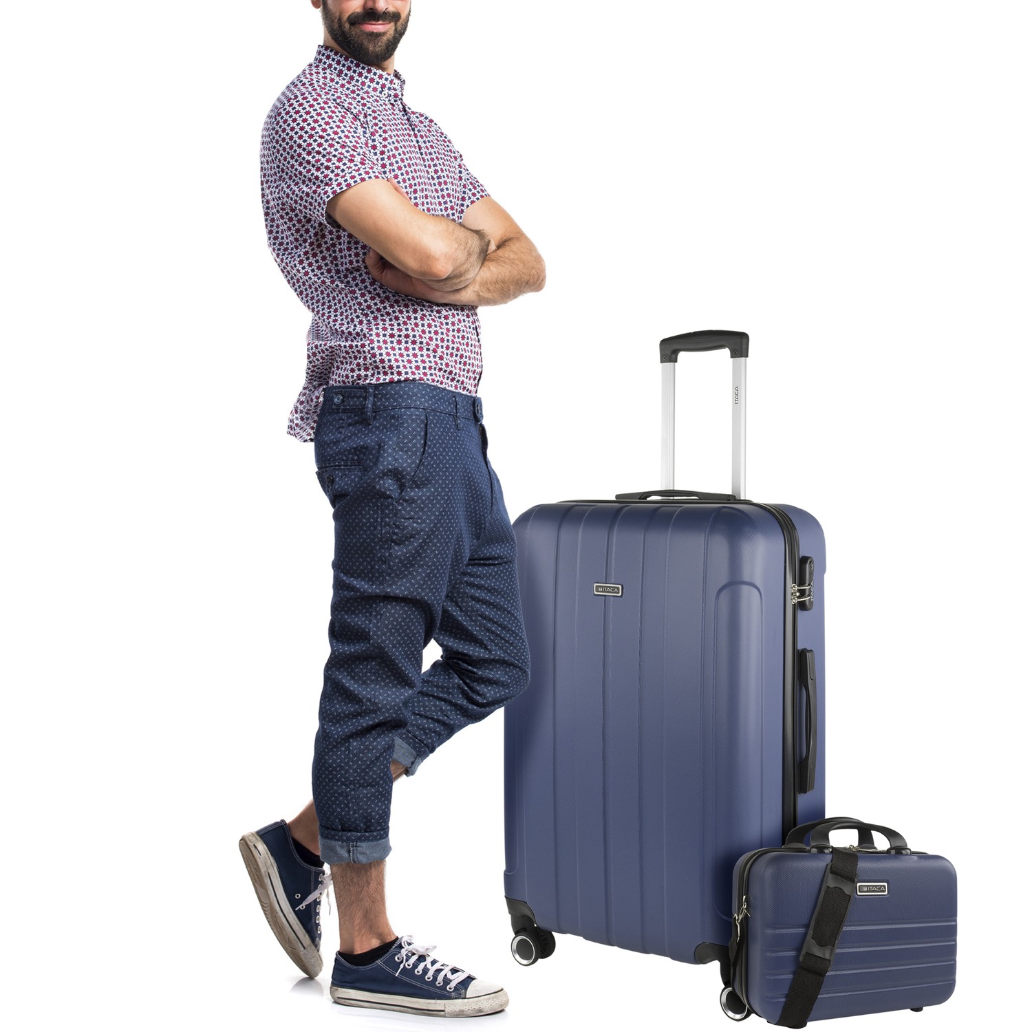 Set di beauty case + valigia taglia 70 realizzata in ABS, un materiale leggero e resistente. Un altro vantaggio è che consente una maggiore manovrabilità con le sue 4 ruote girevoli multidirezionali a 360 ° a rotolamento regolare e il suo carrello telescopico con serratura che lo rendono più comodo da maneggiare. Ha una doppia zip scorrevole e un lucchetto a combinazione per una maggiore sicurezza. Allinterno, possiamo vedere la fodera personalizzata del marchio, con separazione centrale. Le cinghie elastiche interne consentono di tenere il contenuto in posizione.