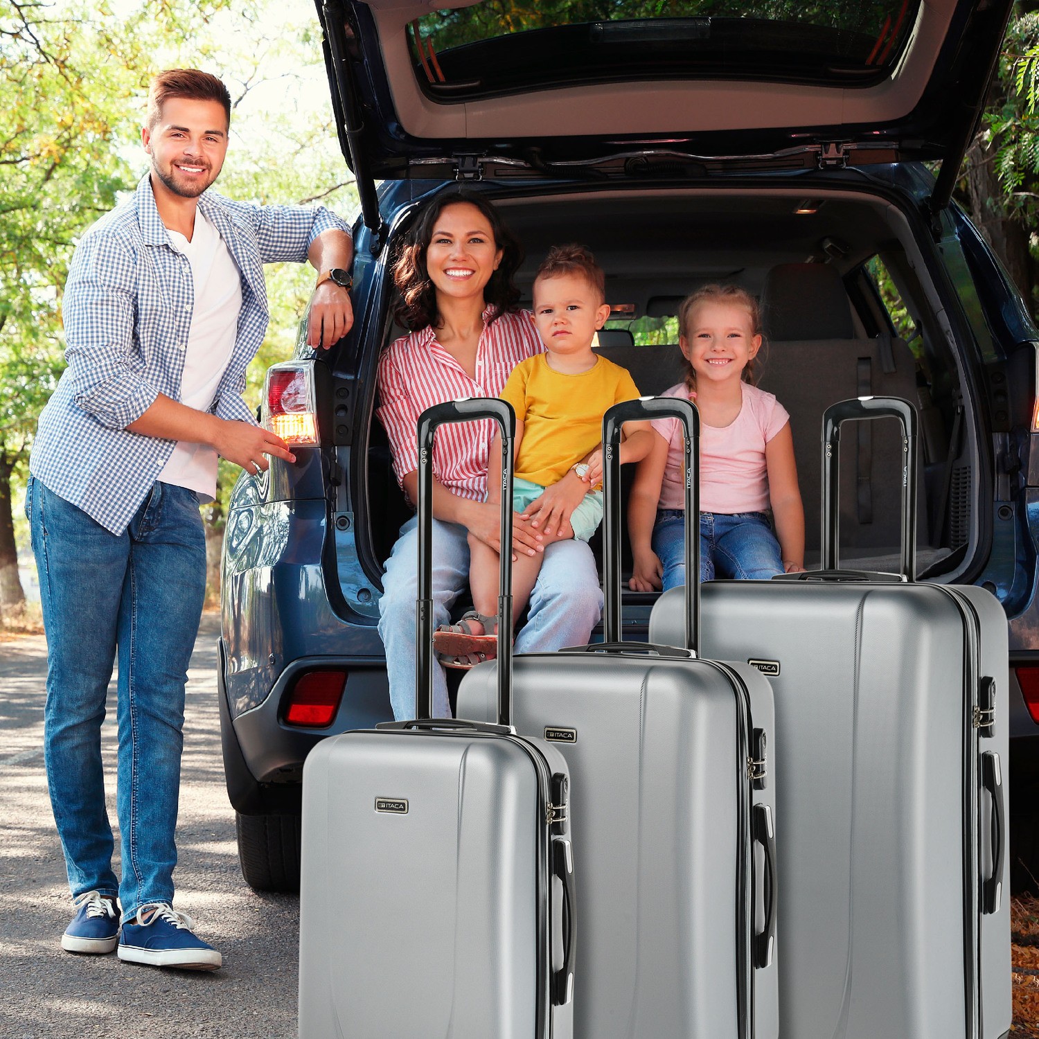 Conjunto de três carrinhos de 50/60 / 70cm da marca ITHACA com design exclusivo e tem vários duas cores coloridas. Com giro de quatro rodas e alça telescópica. Com forro interior.