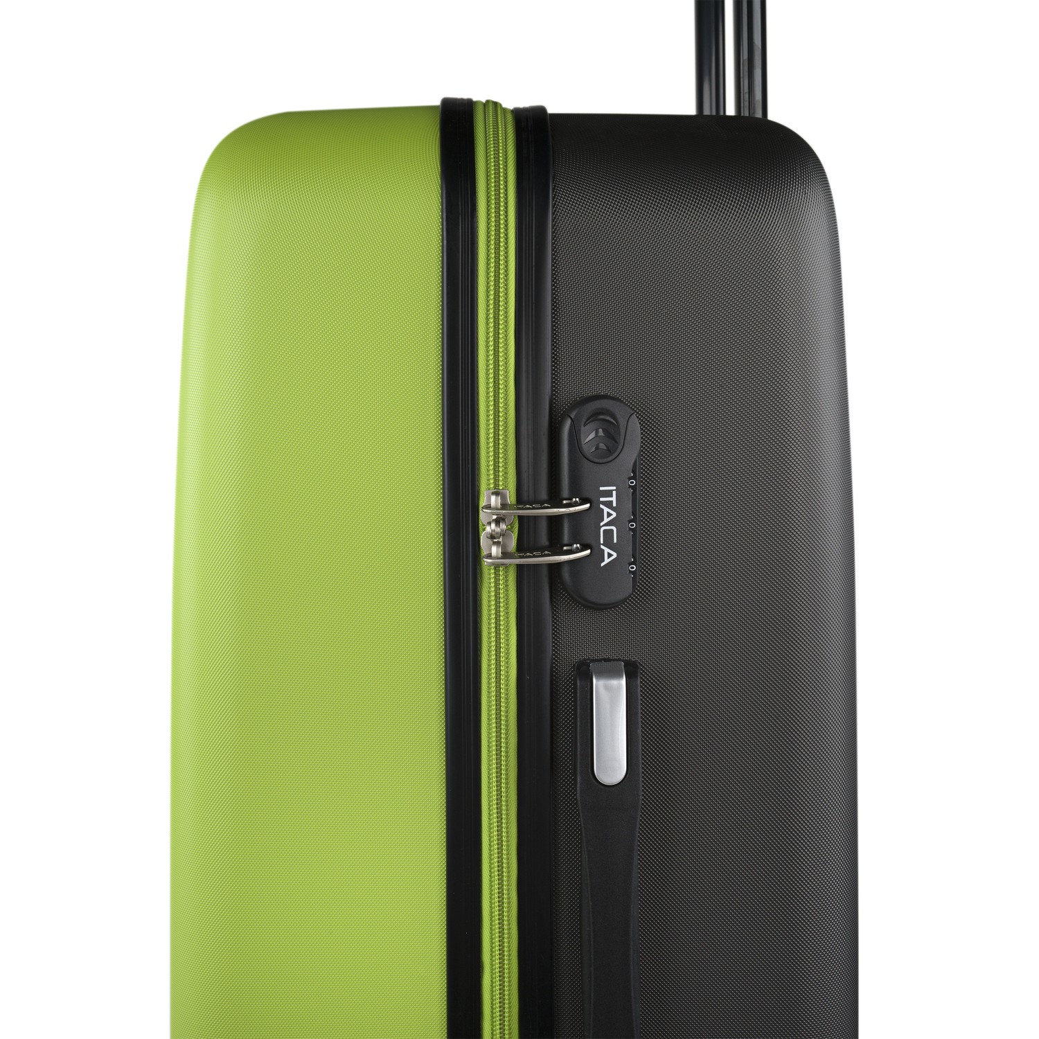 Características de uma alça superior e lateral em três malas.