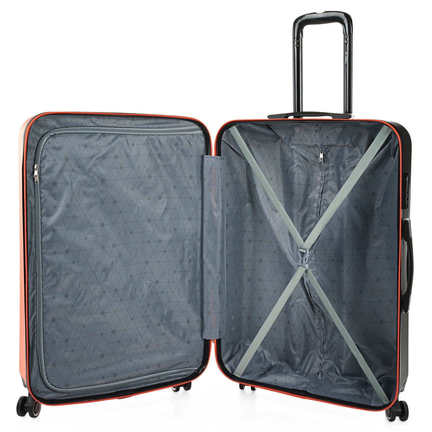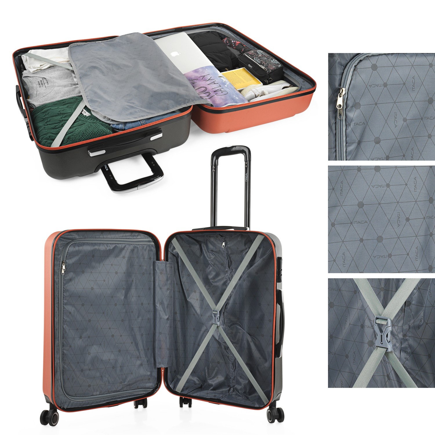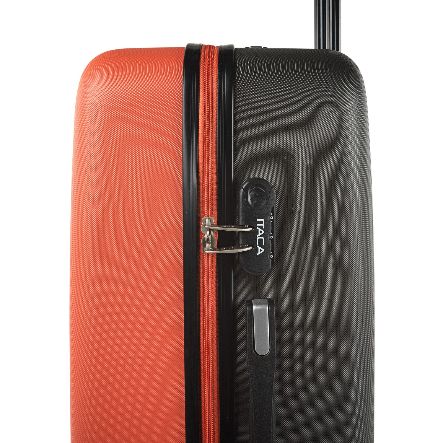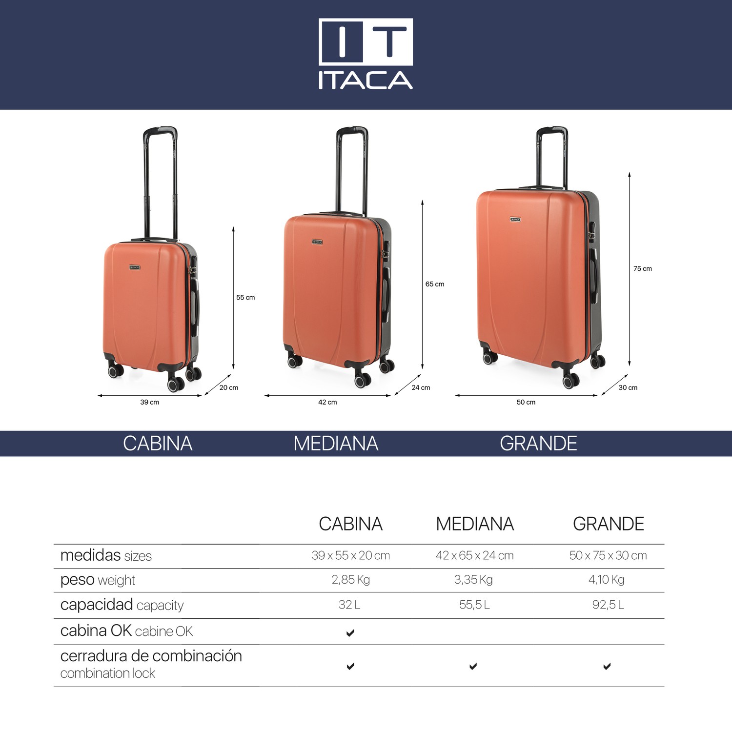 Carrinho grande da marca ITHACA, com um design exclusivo e ofertas de vários bicolor colorido. Com giro de quatro rodas e alça telescópica. Com forro interior. Características de uma alça superior e lateral. O zíper com duplo cursor e tem uma fechadura de combinação. A mala grande medindo 50 por 75 por 30 cm e pesa 4,10 Kg. Os sacos são de ABS.