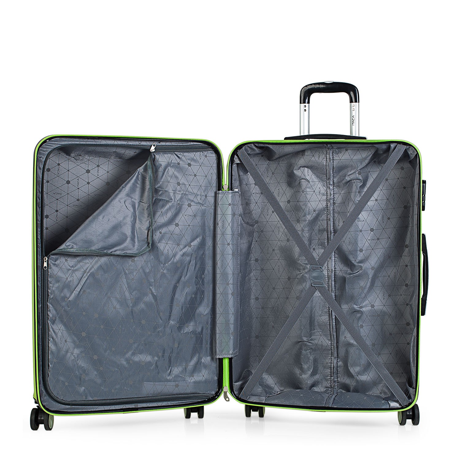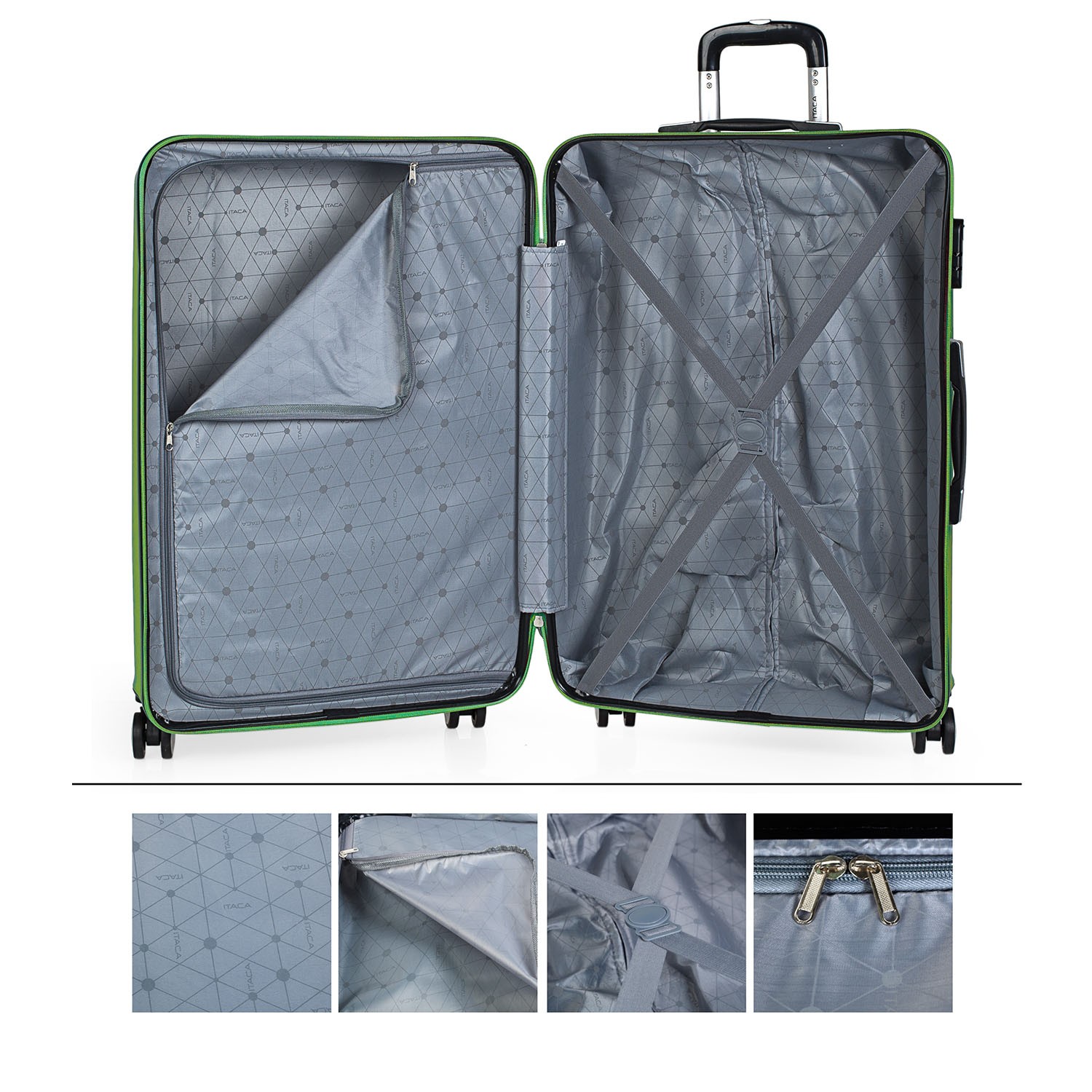 Mala de viagem tamanho 70 feita com ABS, um material leve e ao mesmo tempo resistente. Outra vantagem é que permite maior manobrabilidade com as suas 4 rodas duplas de 360º de rotação do mancal liso rotativo e o seu carro telescópico com trinco tornam o seu manuseamento mais confortável. Tem um zíper com cursor duplo e trava com a combinação LOCK para maior segurança. No interior, contemplamos o forro personalizado da marca, de acordo com o design exterior, com separação central. Ele contém cintas elásticas internas que permitem que o conteúdo seja mantido.